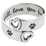 Oslavte bezpodmínečnou lásku a věčné pouto se svým chlupatým společníkem prstenem Forever Love Paw. Elegantní design s otevřeným páskem zdobí jemné otisky tlapek a výřezy ve tvaru srdce, které symbolizují hluboké pouto s vaším domácím mazlíčkem. Citlivý vzkaz „Budu tě milovat navždy“ je vygravírován na vnitřní straně a dělá z tohoto prstenu krásnou památku a připomínku toho, že láska nezná hranic.