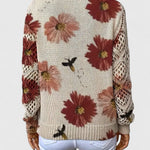Tento jemný pletený kardigan s fialovými a levandulovými květinami dodává každému outfitu subtilní, ženský nádech. Vzdušné rukávy poskytují zakrytí paží, aniž byste museli slevit z pohodlí, a jemný V-výstřih ho činí ideálním pro kombinaci s náhrdelníkem nebo šálou.