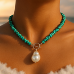 Rozměry a materiály: Tento náhrdelník má perfektní velikost pro každého a elegantně podtrhne váš outfit. Lehký, ale působivý, vyrobený z malých mořských kamínků a postříbřené nerezové oceli, vrcholí velkou smaltovanou perlou. Jedinečný a silný design pro všechny, kteří se chtějí odlišit autenticitou a stylem.