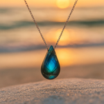 Náhrdelník Lacrima del Mare zachycuje duši moře. Přírodní labradorit s třpytivými odlesky modré a sytě zelené barvy připomíná vlny osvětlené měsíčním svitem a ztělesňuje poezii vody. Perfektní dárek, který symbolizuje introspekci, svobodu a krásu přírody.