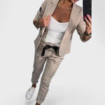 Vladka kombinuje měkký a splývavý blazer, který prodlužuje siluetu, s elegantními joggery s nastavitelným pasem. Výsledek: bezchybný styl od rána do večera. Lehký, prodyšný a pohodlný na nošení, sleduje každý váš pohyb, aniž by vám překážel.