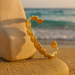 Objevte náramek Aeris, inspirovaný organickými tvary kamenů vyhlazených mořem. S nepravidelným, zlatým a lehce tepaným povrchem odráží sluneční odlesky na vlhkém písku.