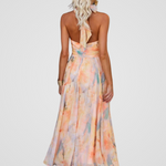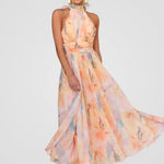 Natálie | Šaty vyzařují čistou letní romantiku. Díky jemnému akvarelovému potisku v teplých broskvových tónech a elegantnímu halter výstřihu jsou dokonalým společníkem pro slunečné dny a vlahé večery.