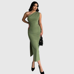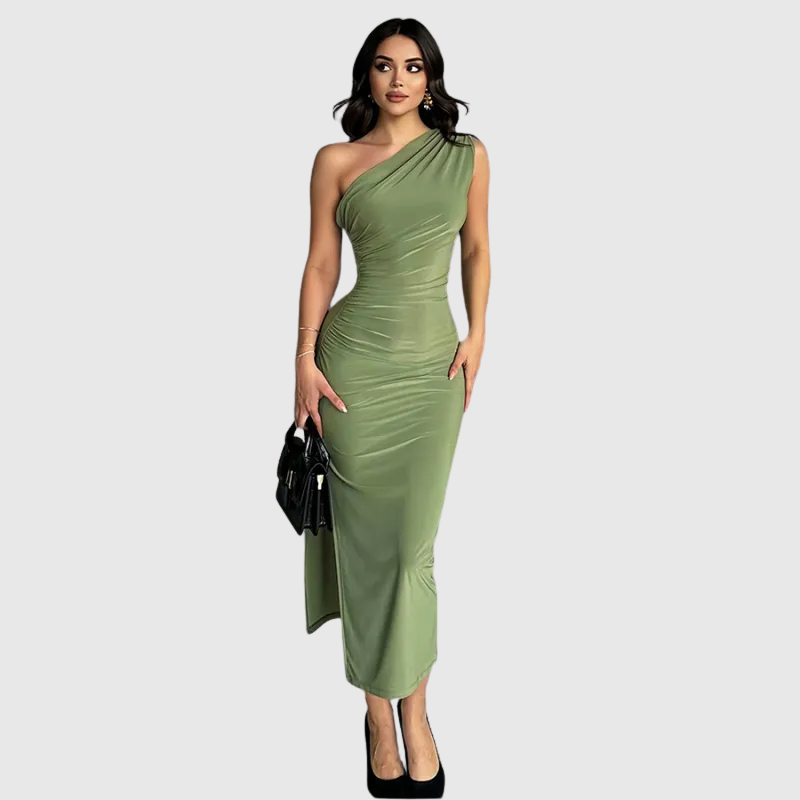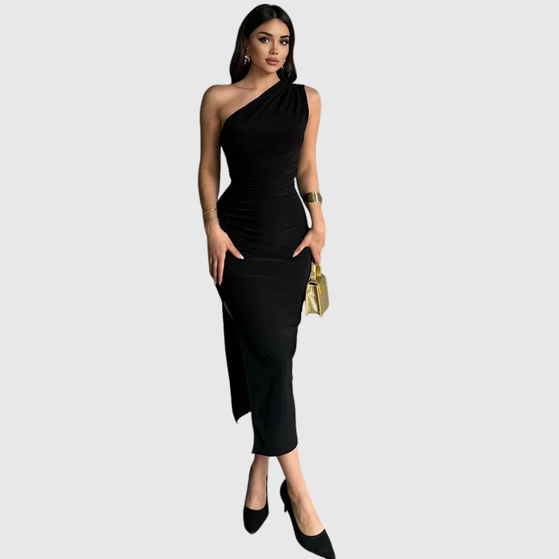 Ať už míříte na koktejlovou party, nebo na elegantní večer, šaty Kaia zajistí, že všechny pohledy budou upřeny na vás. Vyrobeny z hladké, lichotivé látky, tyto kotníkové šaty s jedním odhaleným ramenem a jemnými záhyby zvýrazní vaše přirozené křivky při každém kroku.