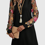 Šaty JOLANTA nenápadně přitahují pozornost. Hluboký výstřih do V elegantně zvýrazňuje siluetu, zatímco průhledné dlouhé rukávy dodávají jemný, ženský nádech.